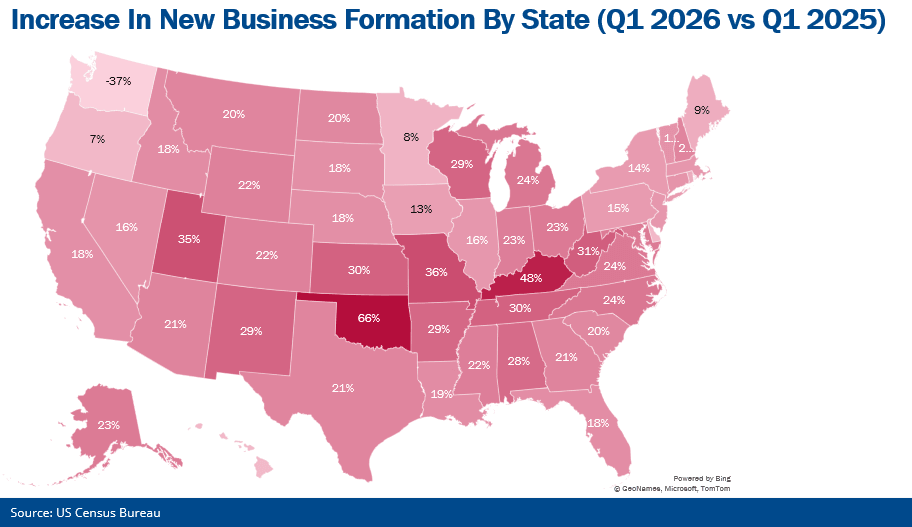 In the first quarter of 2026, Americans started 1.5 million businesses, 18% more than were started in the first quarter of 2025 and a new record. Oklahoma led the nation with a 66% increase in new business formation in Q1 2026 compared to Q1 2025. But six other states had increases of at least 30%: Kentucky, Missouri, Utah, West Virginia, Kansas, and Tennessee. Over the last 12 months, Americans started 5.9 million new small business, also a record.