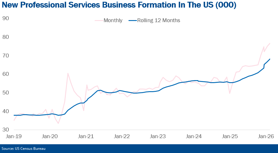 The new businesses being formed are increasingly concentrated in professional services such as accounting, legal, and computer services. Before March 2025, the record for the most professional services firms launched in a single month was 60,000 new businesses. Since last March, the US has averaged 68,000 new professional services businesses per month, 13% more than the previous record. March 2026 saw a record 78,000 professional services businesses started. The first quarter of 2026 saw 224,000 new small, professional services businesses formed.