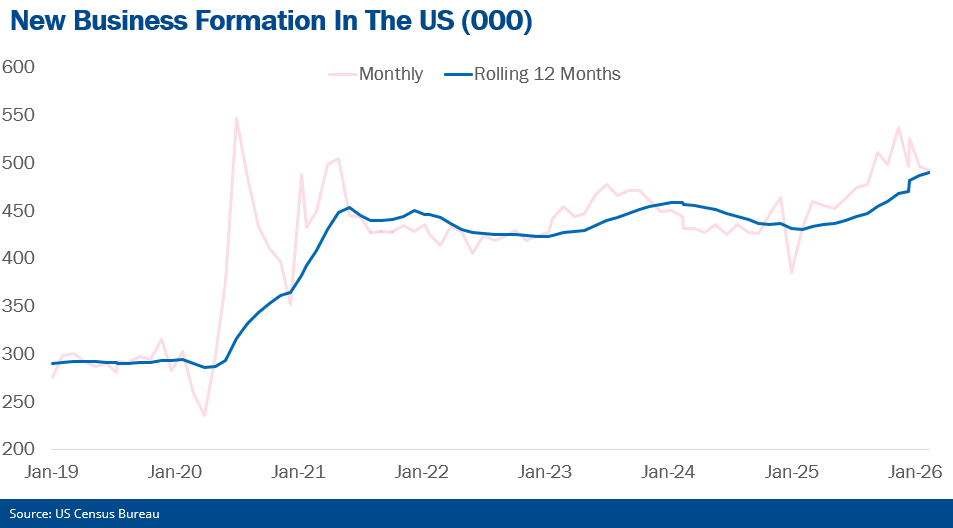 Americans formed 492,000 new businesses in March, the most ever for the month of March. That comes after February 2026 saw 496,000 new businesses launch, the most for any February. January also set a record for January as did December and each month since September 2025.